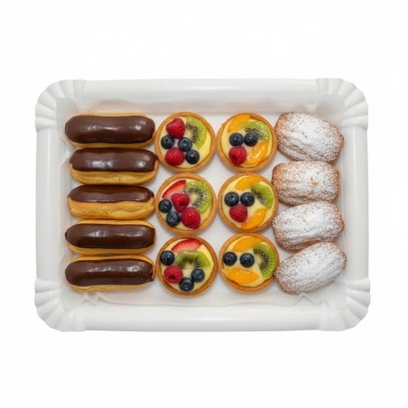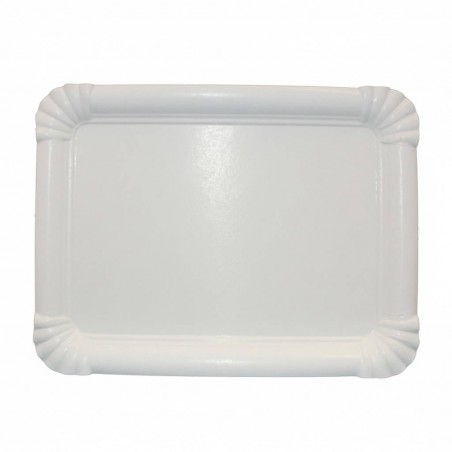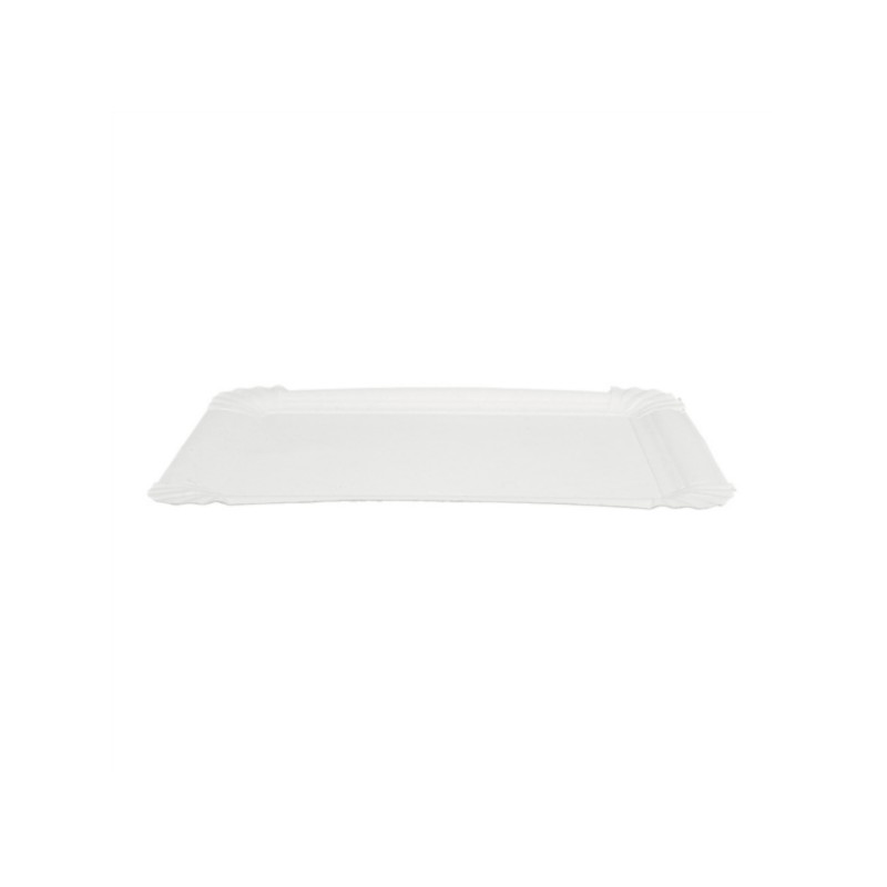 Bandeja rectangular de cartón blanco desechable, ideal para servir y presentar alimentos de forma práctica y ecológica tanto en hostelería como en eventos o take-away. Perfecta para snacks, tapas, postres y pequeñas porciones.