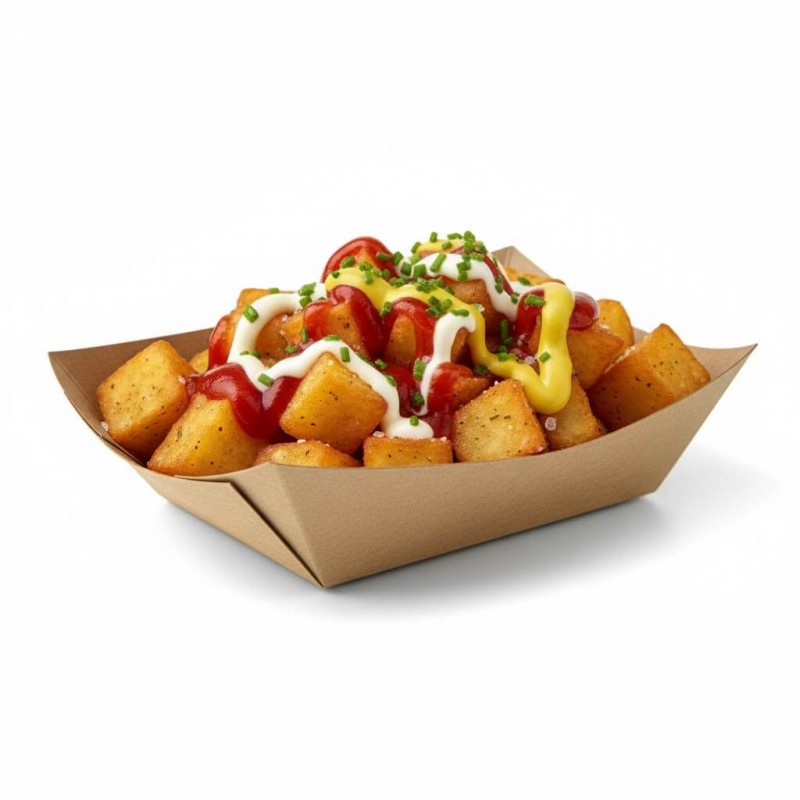 - Bandeja fabricada en papel antigrasa apta para productos con salsa, aceite, etc.