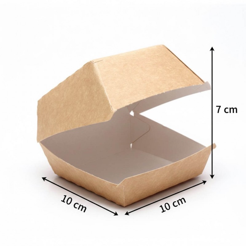 Envase de cartón kraft resistente y reciclable, ideal para servir y transportar hamburguesas individuales en locales de comida rápida, take away y servicios de entrega. Su diseño práctico mantiene el producto seguro y fácil de manipular durante el servicio.