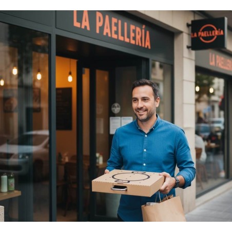 - ¿Por qué nuestra caja es el mejor packaging para paellas personalizable que existe? Si lo comparamos con la tapa de cartón para llevar paellas, el formato caja es mucho mas seguro, mantiene mejor la temperatura y ofrece mas rigidez en el transporte.