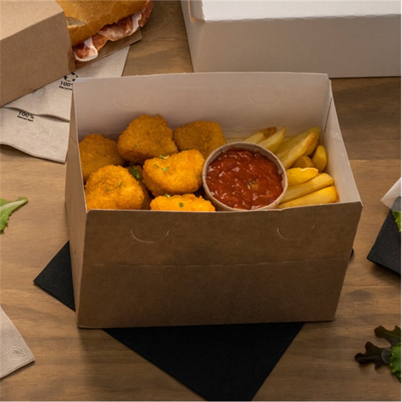 - Caja de papel fabricado con tratamiento antigrasa apto para productos con salsa, aceite, etc.