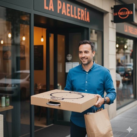- Por que a nossa caixa é a melhor embalagem personalizável para paellas que existe? Se a compararmos com a tampa de cartão para levar paellas, o formato caixa é muito mais seguro, mantém melhor a temperatura e oferece mais rigidez no transporte.