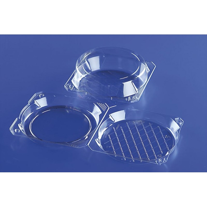 EMBALAGEM PARA CONFEITARIA COM TAMPA ARTICULADA PET 275 mm Ø X 65 mm. (130 Unid.)