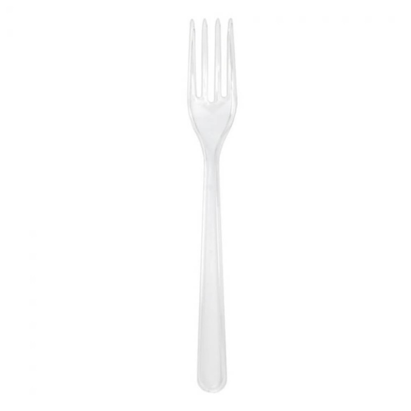 Garfos descartáveis fabricados em plástico PS transparente. Reciclável e reutilizável.