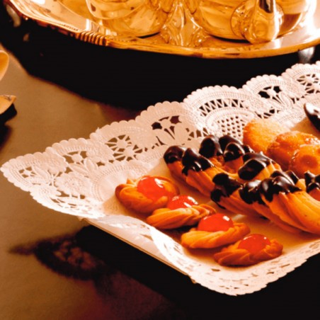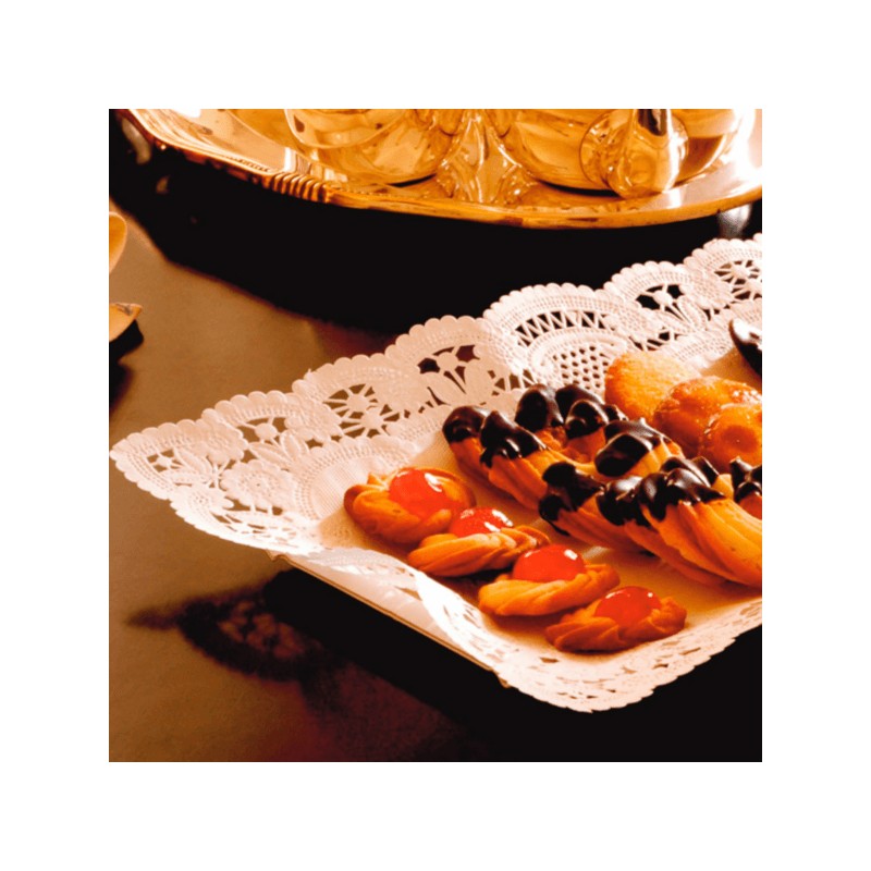 Blonda de papel branca recortada 14×24 cm, ideal para apresentar e decorar sobremesas, bolos, tortas, doces e aperitivos com um toque elegante e profissional. Fabricada em papel adequado para contacto alimentar, descartável e 100 % reciclável, é uma solução prática para pastelarias, cafetarias, catering e eventos.