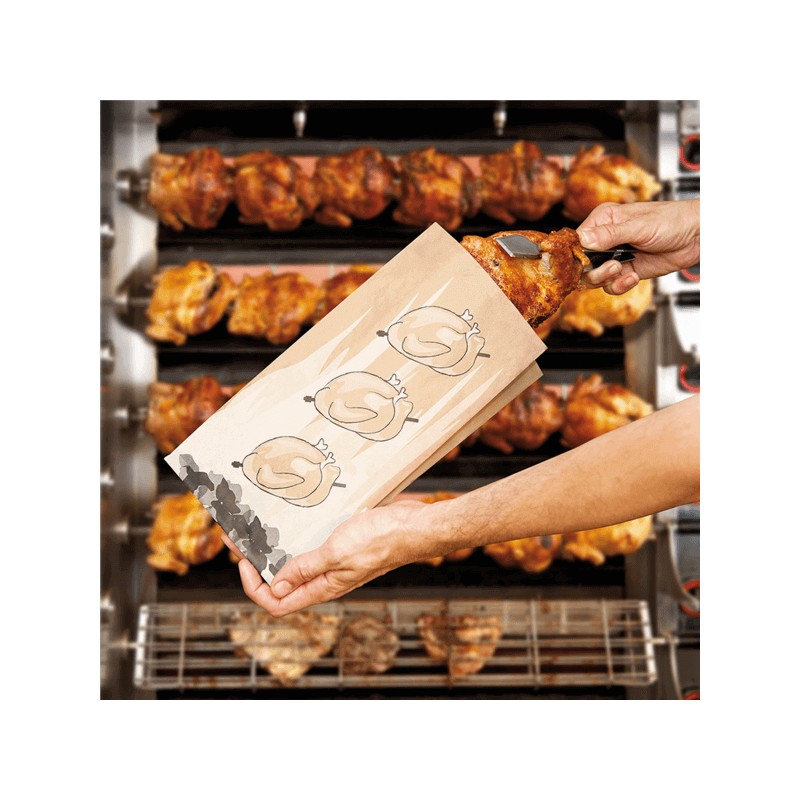 - Perfeita para transportar frango assado. - Gramagem: 45 G/M2 + 15µ PP - Temperatura: -40ºC/+100ºC. - Adequado para micro-ondas e forno. - Resiste óleo e gordura. - O preço indicado é para 100 unidades.