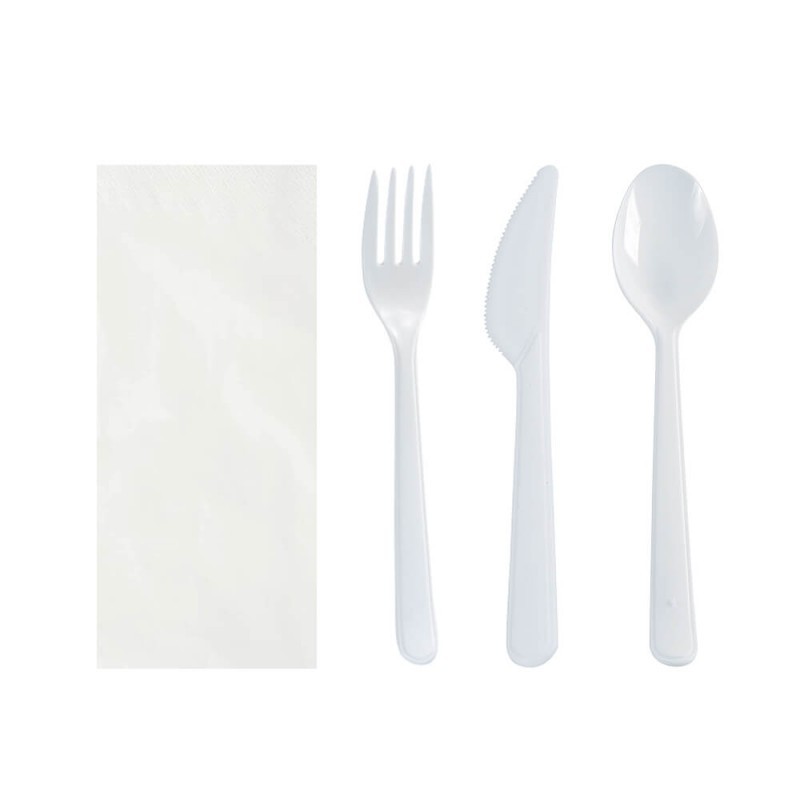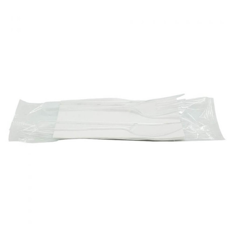 Torne o seu Take away fácil de gerir. Com este conjunto de talheres transparentes com guardanapo branco, você terá tudo o que precisa para acompanhar seus pedidos ou suas bandejas individuais, cuidando da higiene do serviço. Estes talheres são fabricados em plástico PET, o que os torna um material facilmente reciclável, reutilizável e respeitador do meio ambiente.