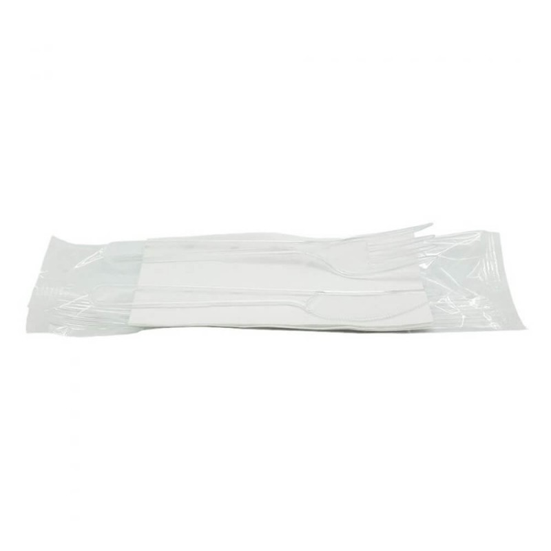 ▶️Conjunto de talheres transparentes com guardanapo branco reciclável e reutilizável, composto por garfo, faca e guardanapo.